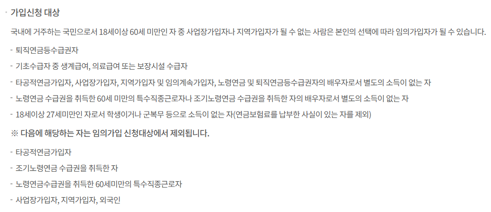 국민연금에는 임의가입과 임의계속가입 제도가 있습니다. 이는 국민연금 의무가입기간이 지났지만, 최소 납입기간인 10년을 채우지못한 경우 이용할 수 있는 제도입니다.