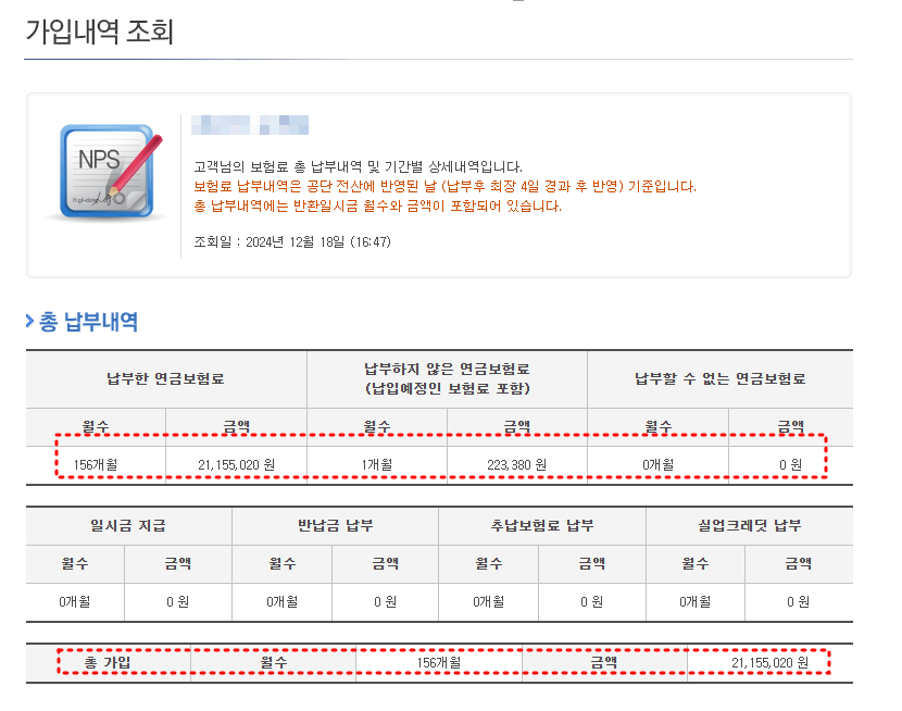 가입내역 조회 창으로 이동하면 총납부내역과 총가입기간, 그동안 납부한 연금금액 상세내역 등을 자세히 확인할 수 있습니다.