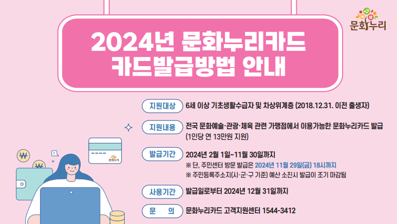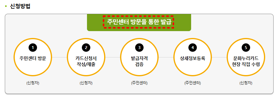 온라인 신청: 문화누리카드 홈페이지에서 신청 가능합니다. 회원가입 후 본인 인증 절차를 거쳐 신청할 수 있습니다.
