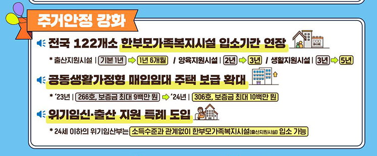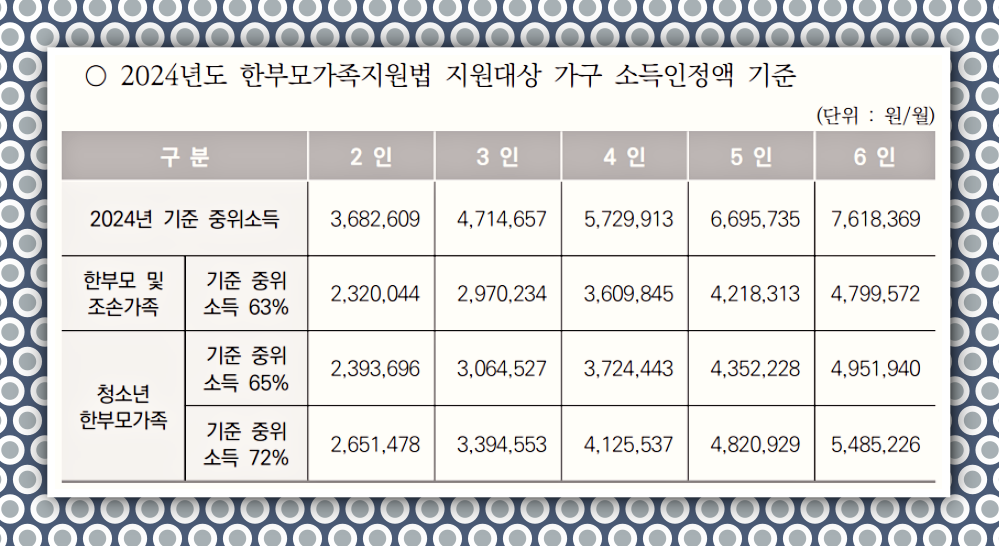 2024년 한부모가정 자격조건 중 소득인정액 기준이 변경되어 만 18세 미만의 자녀를 홀로 키우는 가정의 소득 수준이 2024년 기준중위소득 63% 이하로 소득기준이 인상되었습니다.