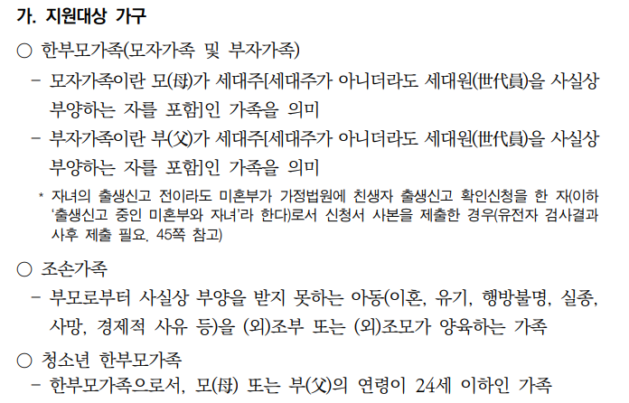 부모 중 한 사람과 만 18세 미만의 자녀로 구성된 가정이거나, 조부모 중 한 사람이 손자녀(18세 미만)를 양육하는 조손 가정이어야 합니다. 청소년 한부모가정의 경우, 만 24세 이하의 부모 중 한 사람이 자녀를 양육해야 합니다.