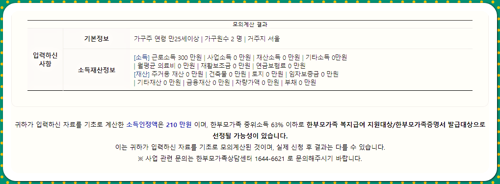 결과보기 창은 하단과 같이 표시되며, 기본정보에 따른 소득재산정보가 표시되며, 하단에 가구의 소득인정액과 중위소득 위치, 신청가능여부가 표시됩니다.
