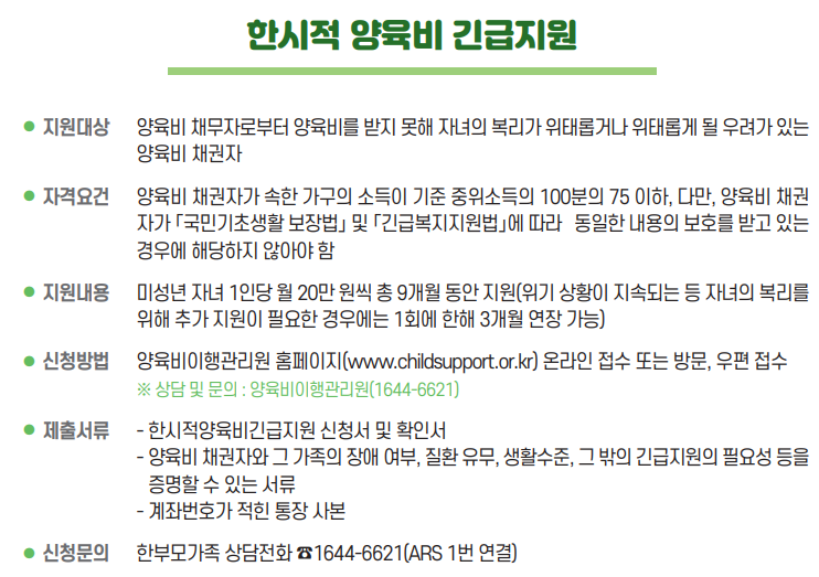 한부모가정의 가장 큰 문제로 계속되고있는 것은 경제적 부담일 텐데요, 현재는 한시적 양육비 긴급지원제도를 통해서 미성년자 자녀 1인당 월 20만원씩 총 9개월 동안 지원받을 수 있는 혜택이 있습니다.